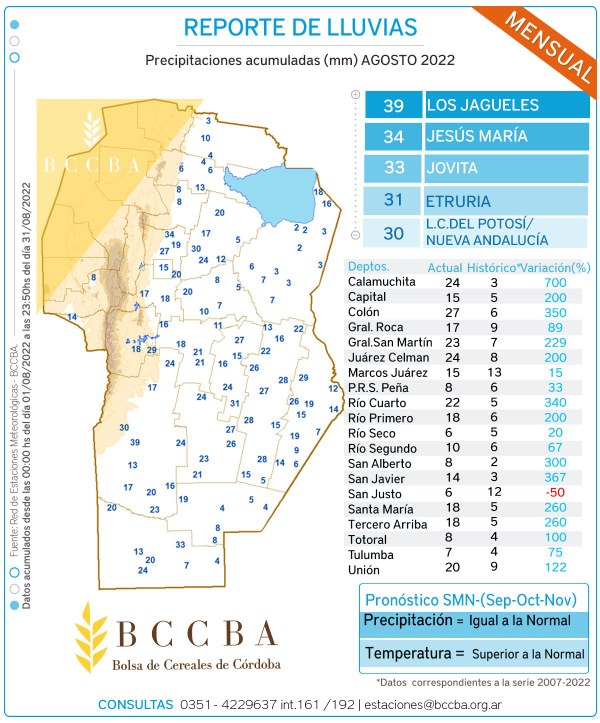 A lo largo del último trimestre las precipitaciones acumuladas estuvieron por encima del promedio histórico (2007-2021) en varios departamentos de la provincia, siendo favorecidos por las lluvias principalmente durante agosto. Si bien los milímetros caídos aliviaron en parte al trigo, no fueron suficientes para acumular humedad en el perfil.