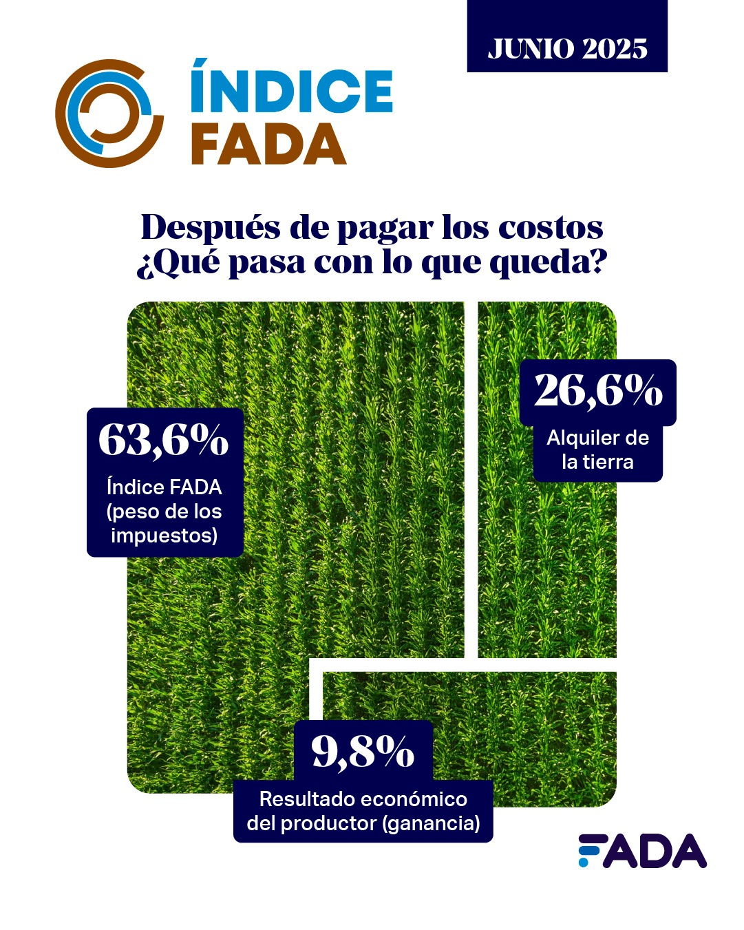 “Para producir es necesario pagar diferentes costos: las semillas, los fertilizantes, los salarios, fletes, seguros, etc. Una vez que se cosecha, se vende el cultivo. La plata que queda después de pagar los costos se divide en 3: el valor de quienes alquilan la tierra para producir (26,6%), la ganancia (9,8%) y los impuestos que se pagan (63,6%). Esto último medimos en el Índice FADA, cuánto es el peso de los impuestos para quienes trabajan la tierra”, explica Nicolle Pisani Claro, Economista Jefe FADA.