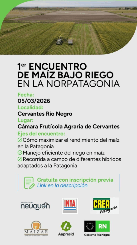 El próximo 5 de marzo se realizará en Cervantes, Río Negro, el Primer Encuentro de Maíz bajo Riego en la Norpatagonia, una jornada técnica que busca consolidar el crecimiento del cultivo en los valles patagónicos y potenciar su integración con la ganadería, la industria y el desarrollo regional.